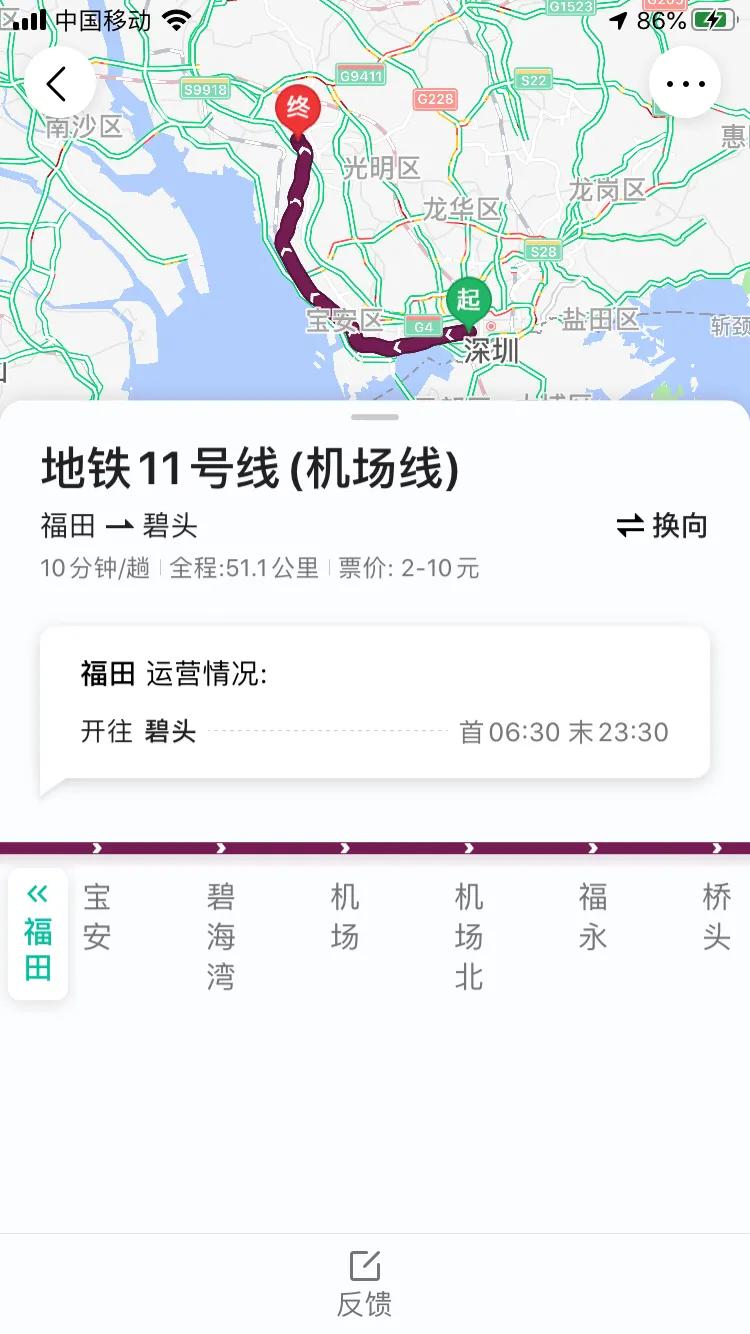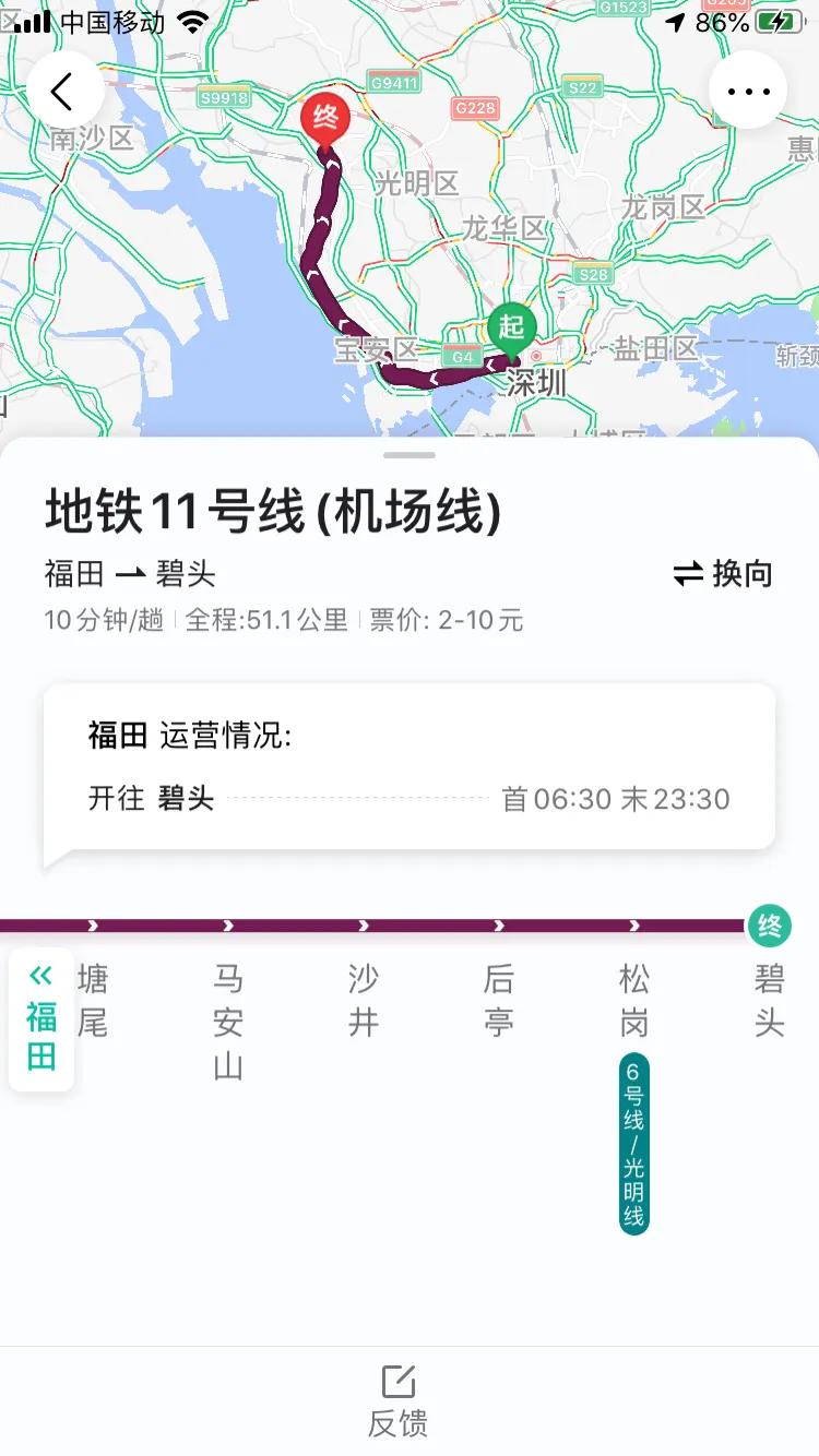 福田→车公庙→深圳湾公园→后海→桂庙→前海湾→宝安→碧海湾→机场→机场北→福永→桥头→塘尾→马鞍山→沙井→后亭→松岗→碧头