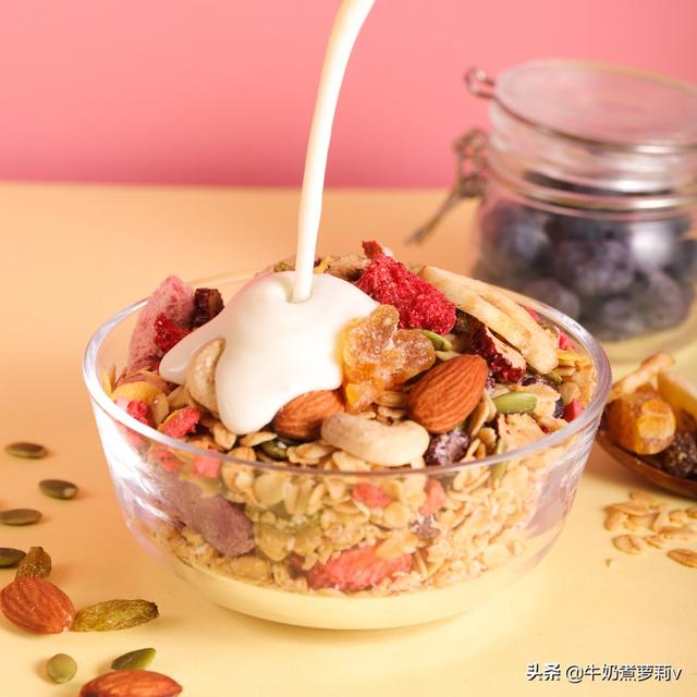它的麦片富含膳食纤维,吃起来口感是香香脆脆的那种。里面还有好多酸奶块、水果干、坚果之类的,能直接干吃,就像零食一样。也可以用牛奶、酸奶泡着吃,不用等,1分钟就搞定了。推荐拌酸奶口感最佳,还能冻到冰箱里做冰淇淋。夏天它简直就是我的最爱啊!!!