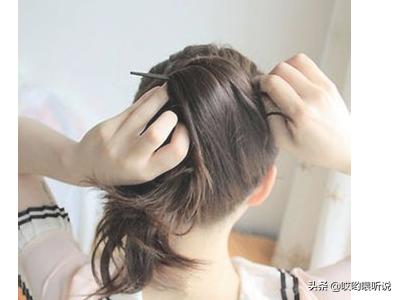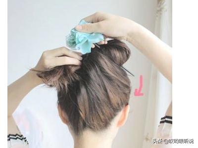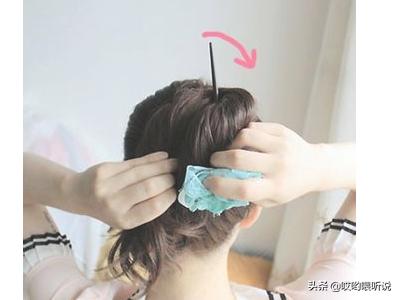 5、发簪向上,越过之前拧的圆圈上方,在最左上角的时候,将发簪转向下方,再插进头发里面。下面这张可以看得更清楚一些,发簪转个弯再插入头发,从上到下,从左到右穿出头发。
