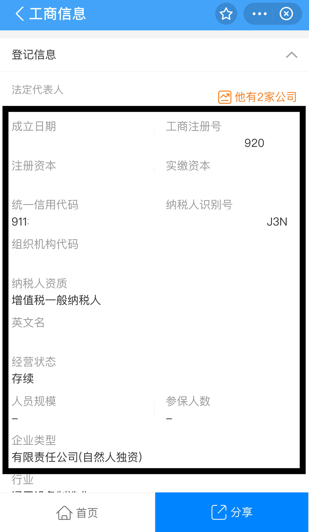 5.进入工商信息页面后,找到 统一信用代码,第二位就是企业行业代码了。