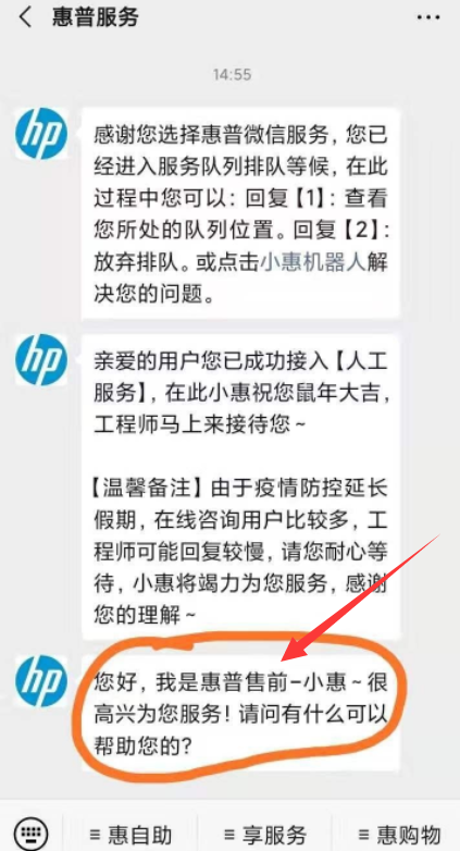 1.搜索微信惠普服务公众号并关注。
