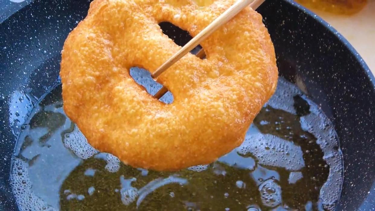 油饼放入锅中定型后一定要多翻动,使油饼受热均匀一些,炸制表面金黄就可以捞出了。