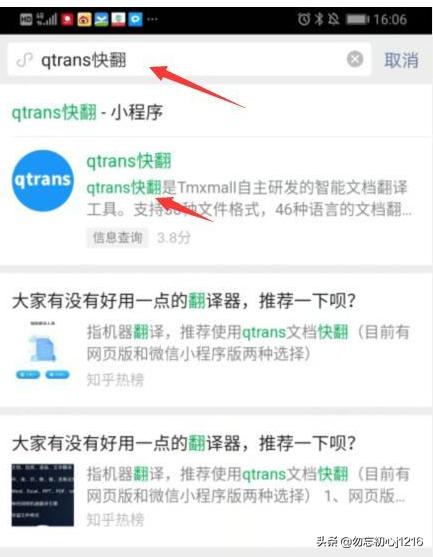 2、在搜索框中输入qtrans快翻,点击进入小程序。