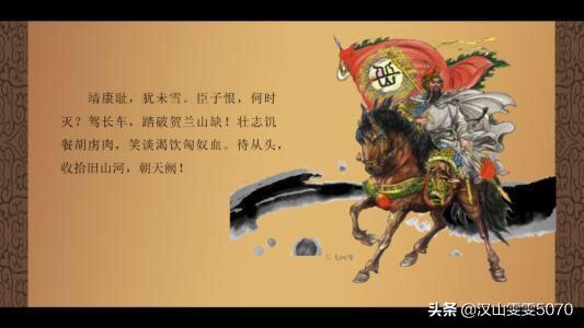 靖康耻,犹未雪;臣子恨,何时灭。驾长车,踏破贺兰山缺。壮志饥餐胡虏肉,笑谈渴饮匈奴血。待从头、收拾旧山河,朝天阙。