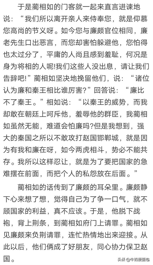 战国时,赵国的武将廉颇和文臣蔺相如不和,廉颇好胜心强,处处为难蔺相如。蔺知道后,为国家的大局着想,每次都故意躲开,避免与廉正面冲突。廉知道后很惭愧,于是背上荆条到蔺的门上请罪。