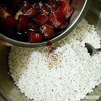 将泡好的糯米沥水,把腌鲜肉的汤汁倒进糯米中,拌匀。