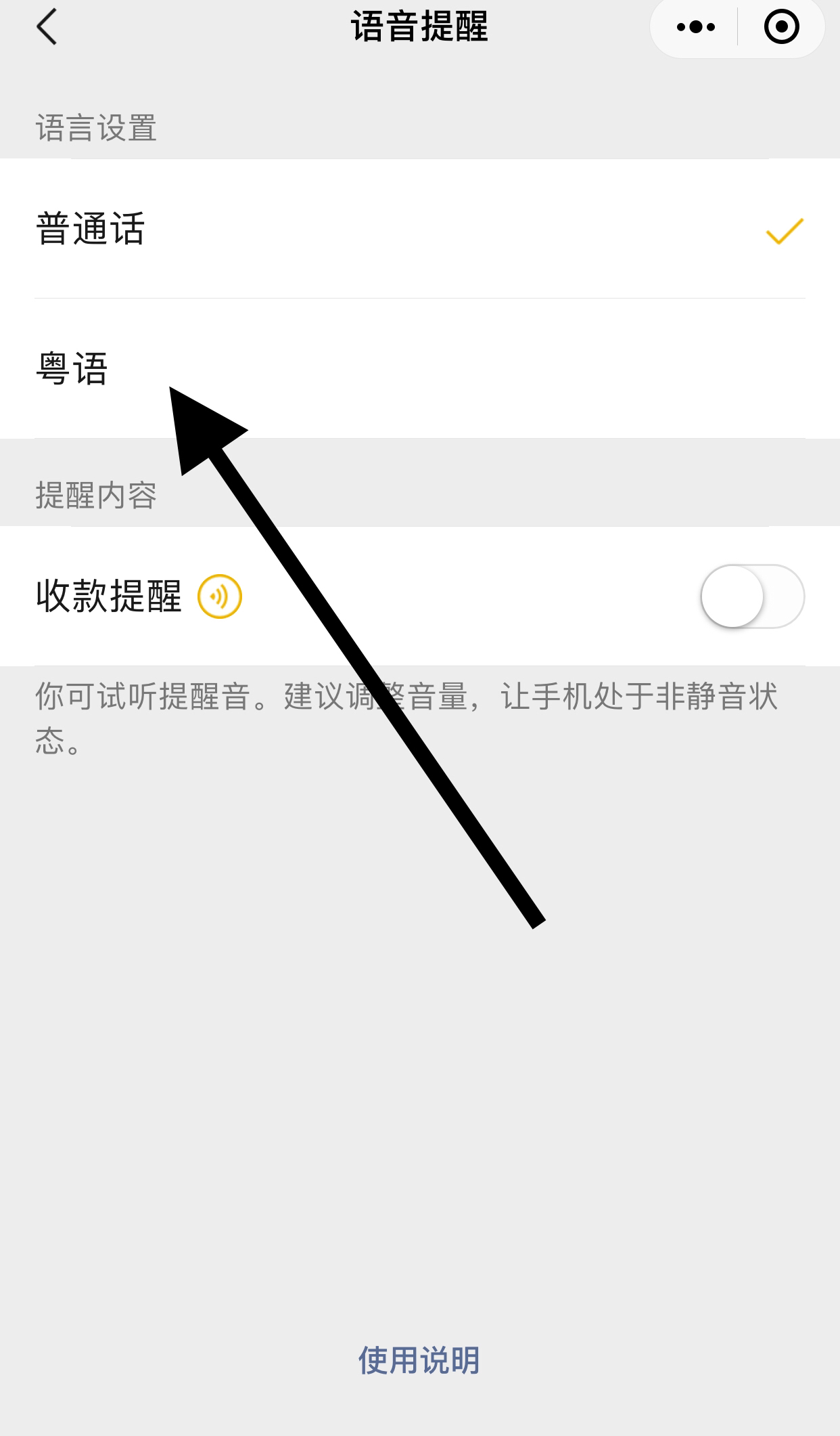 6.进去语音提醒页面后,把 收款提醒 右侧的开关打开,在上方选择语音,就可以设置好收款提示音了。