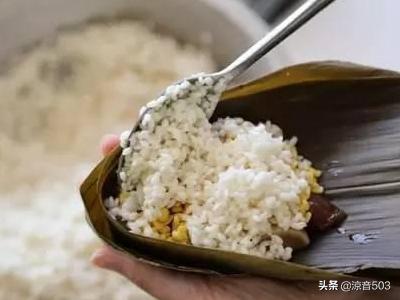 4、再次加入糯米,用汤匙压实,使之与漏斗口齐平。不能加太少,以免粽子看上去干瘪;也不能加太多,以免粽子在煮的过程中散架。