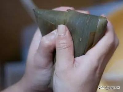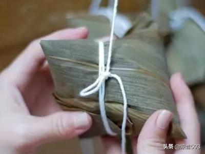 6、用绳子捆住粽子。整个过程都要用手压住,一不小心糯米就会漏出来。