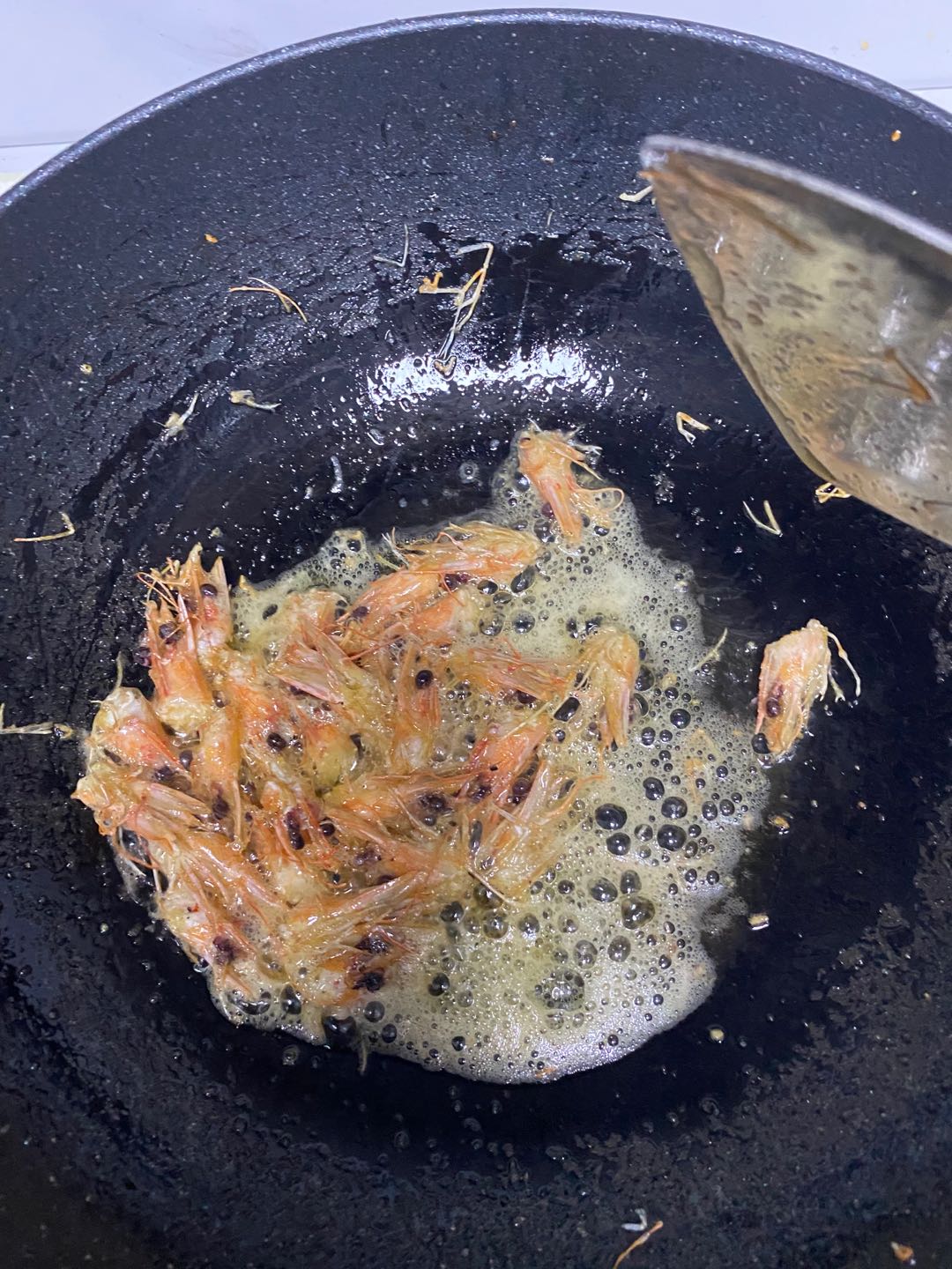 锅中倒油,小火慢烧,把刚才的虾头倒入锅内,小火慢烤,慢慢的把虾油炒出来,烧到油有很多沫沫的时候,再用锅铲按压几下即可。