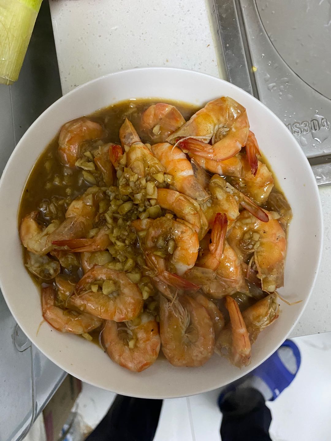 最后一步加点鸡精就可以装盘出锅了,一道美味的家庭版蒜末基围虾就完成了。