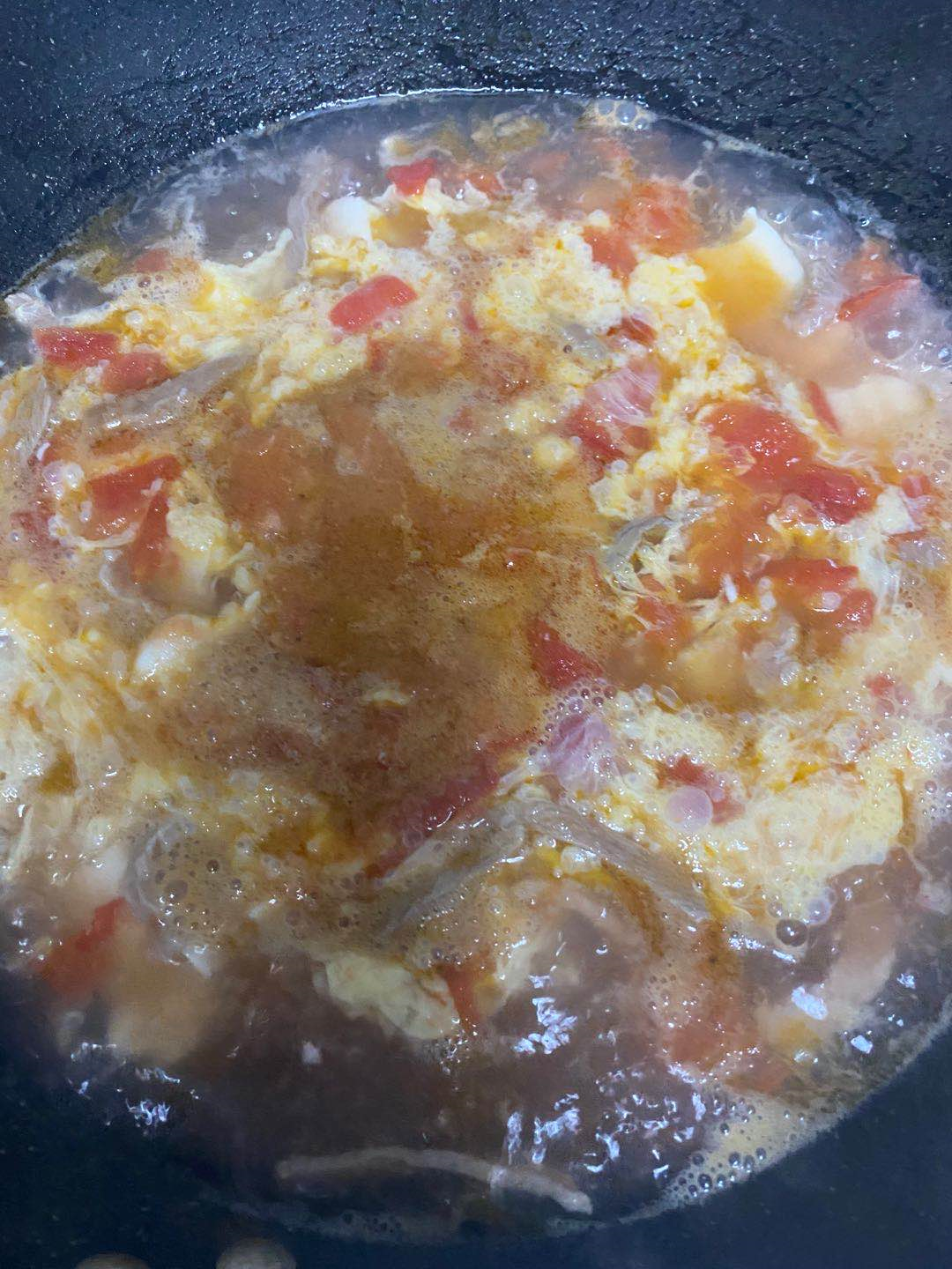 7、一道美味的家庭版西红柿鸡蛋肉丝豆腐汤就完成了,然后就可以出锅了。