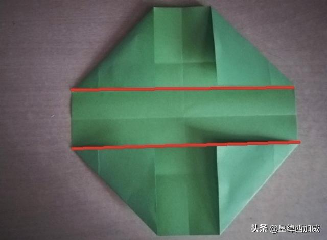 5、上一步折完之后,把四个角折回来,折回来的时候有一条边要与上一步的两条折痕相重合,图中红线所示的就是上一步形成的折痕。