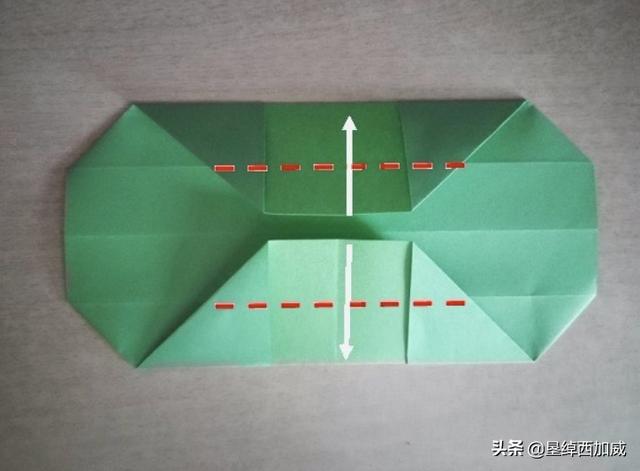 6、这时候转到背面,然后沿着图中的折线把上下两部分向中间折。