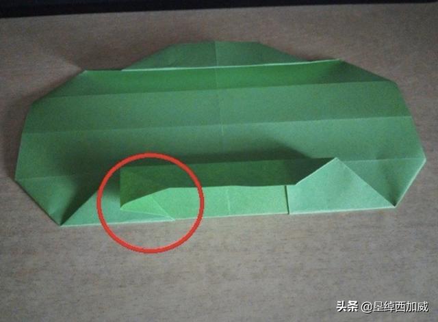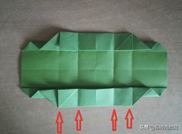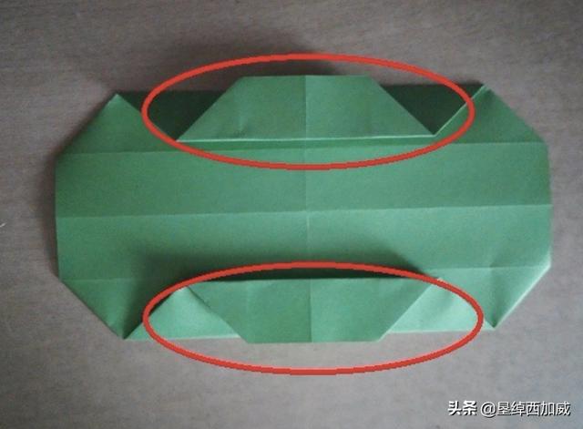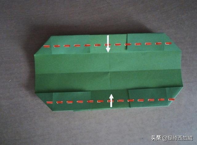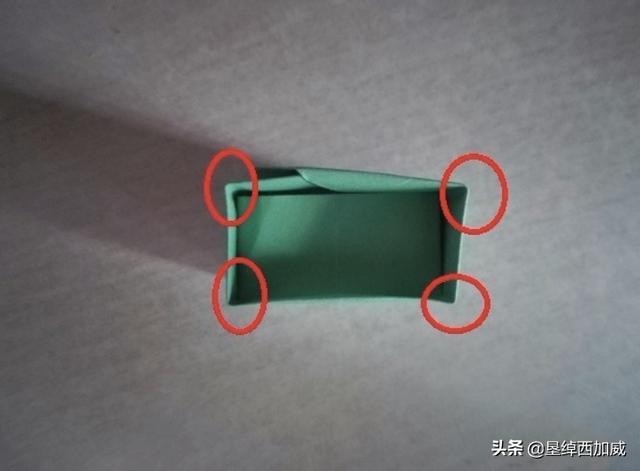 14、从侧面看盒子是这样的,红圈所标识的是第11步折出的四条折痕的位置。
