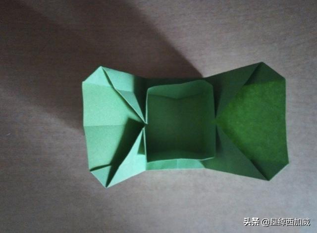 13、两边都折起来就有盒子的模样了,然后再将上面多余的部分折回来当做盒子的盖子。