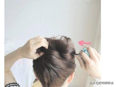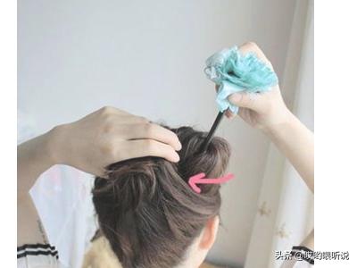 5、发簪向上,越过之前拧的圆圈上方,在最左上角的时候,将发簪转向下方,再插进头发里面。下面这张可以看得更清楚一些,发簪转个弯再插入头发,从上到下,从左到右穿出头发。