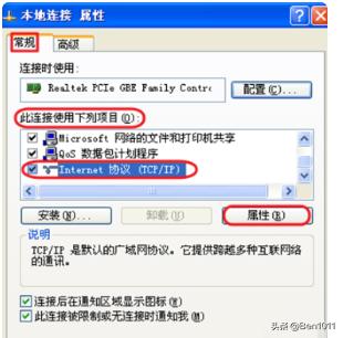 3、在“此连接使用下列项目”下找到“Internet 协议(TCP/IP)属性”双击它---设置成“自动获得IP地址”和“自动获得DNS服务器地址”即可。也可以找你的宽带提供商要他们的准确的DNS服务器地址。