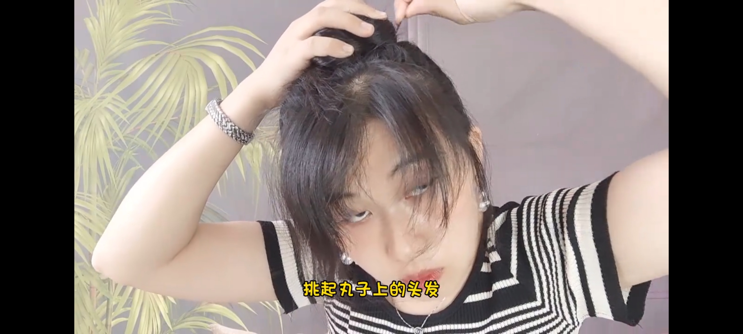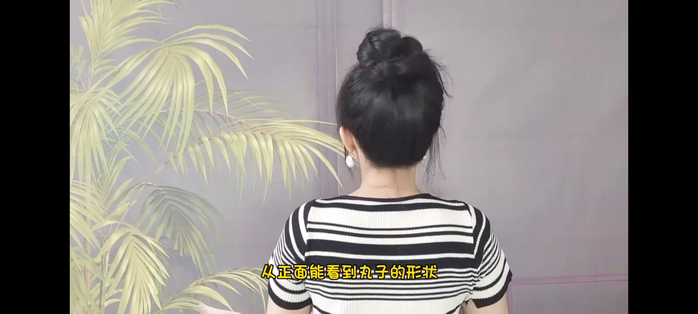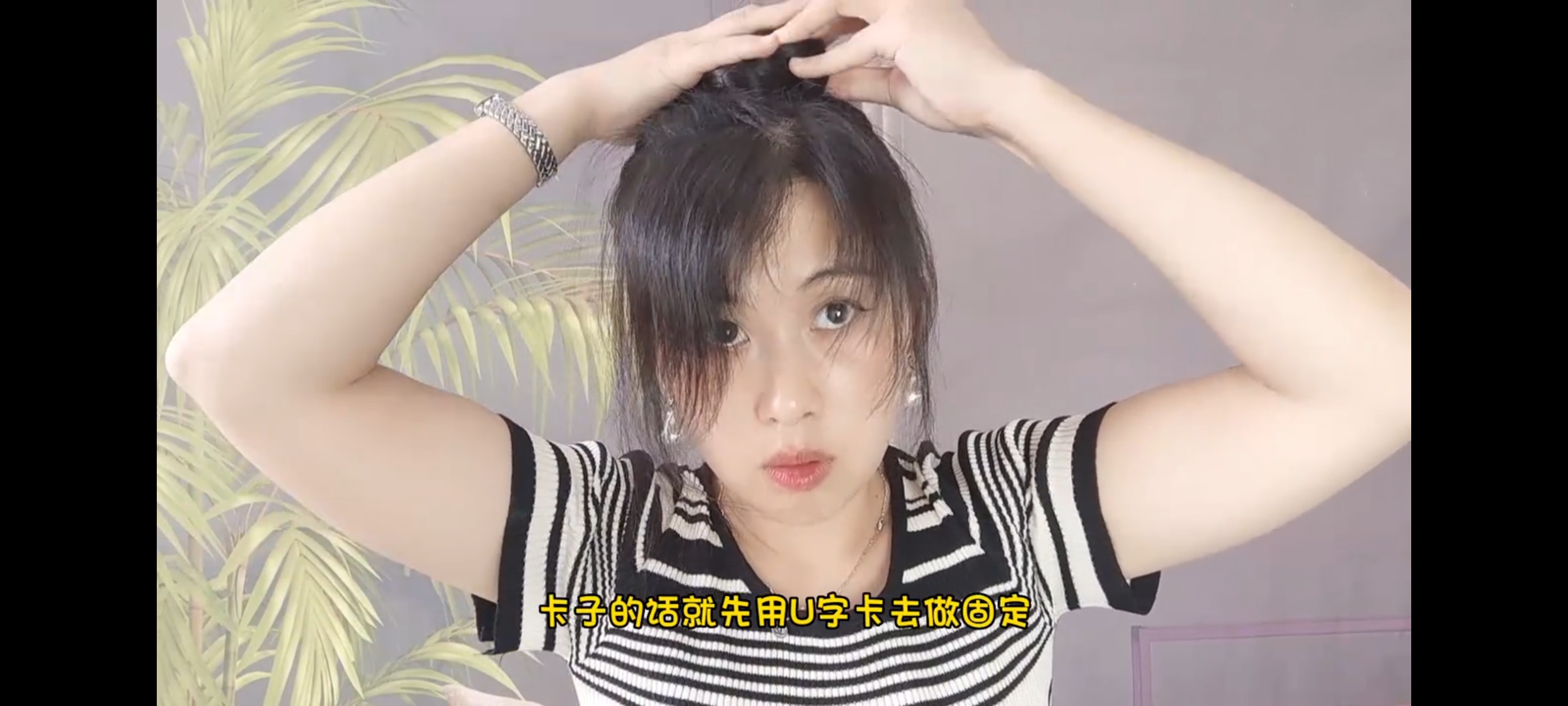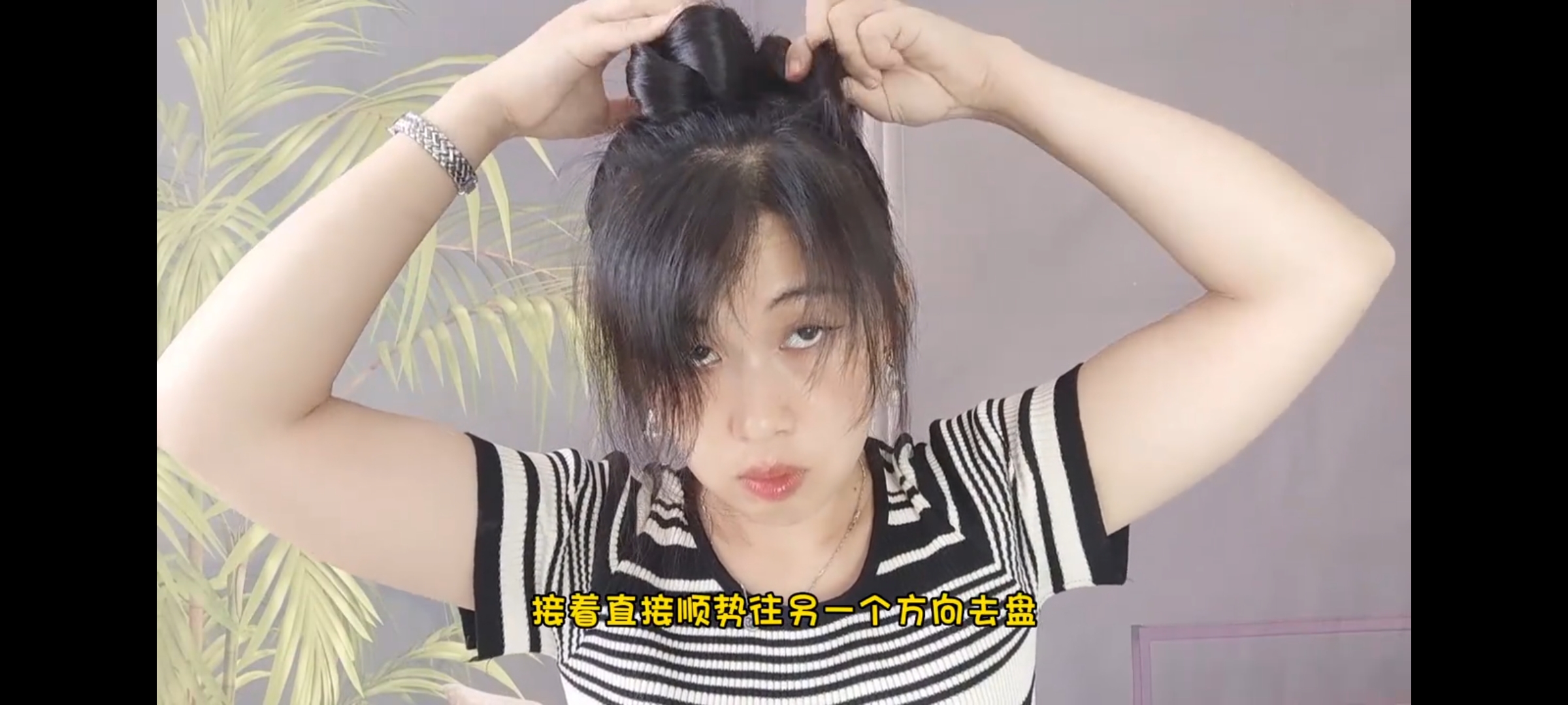 接着顺势把头发盘在头上,用皮筋或者卡子固定住