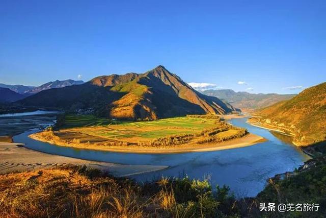 到了香格里拉县的沙松碧村,突然来了个100多度的急转弯,转向东北,形成了罕见的"V"字形大弯,“江流到此成逆转,奔入中原壮大观”,人们称这天下奇观为“长江第一湾”。