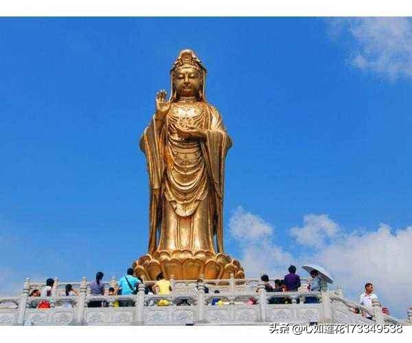 普陀山乃是中国四大佛教名山之一:安徽九华山、山西五台山、四川峨眉山、浙江普陀山。坐落于舟山群岛的岛屿上,每当节假日游客络绎不绝,来这里的人大多不是主要以游玩为主都是带着心愿来的,据说很灵验而且只要如愿了就要连续来三年还愿。我身边就有去过如愿的朋友而且每年都会去一次,也许有人会说这是封建迷信,怎么说呢这东西信则有不信则无。虽然我也去过许愿没能如愿但是我还是每年都会去一次。 2 普陀山上共有三大寺: 普济禅寺 、法雨寺、慧济寺 ,只要来请愿 的必去这三大寺,当然还有多个风景不错的景点就不一一介绍了,来主要介绍下题主问的南海观音:南海观音乃是普陀山的镇山之宝,它建于1996年 立像台座三层,总高33米,其中佛像18米,莲台2米,台基13米,台基面积为5500平方米。佛像顶现弥陀,左手托法轮,右手施无畏印,,体现了观世音菩萨“慧眼视众生,弘誓深如海之法身”。 佛像采用新型仿金铜精铸,为普陀山增添了新的人文景观,成为海天佛国的象征。“千处祈求千处应,苦海常作渡人舟”的观音大士,是世上佛教信众的信仰核心。“南海观音慈悲大千,普陀新景光照千秋。” 3 据说这里还发生过传奇的事,就在南海观音刚建成揭开面纱的时候天上突然显现出白色观音立姿圣象,在场人员无不狂欢鼓掌。舟山地处海边浙江又是每年台风多发地,每当台风来临时这里就要停船闭岛。但是奇怪的是每次台风路来临即将登岛时就会突然的改变风向绕过普陀山。