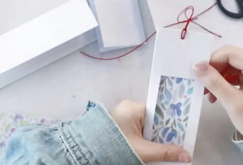 将白色长方形卡片对折,在表层划开一个长方形。