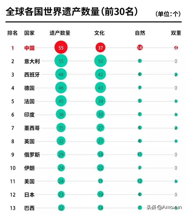 截至2019年7月6日,中国世界遗产已达55项,其中世界文化遗产37项、世界文化与自然双重遗产4项、世界自然遗产14项,与意大利并列为拥有世界遗产最多的国家[1](55项)[2]。[3]