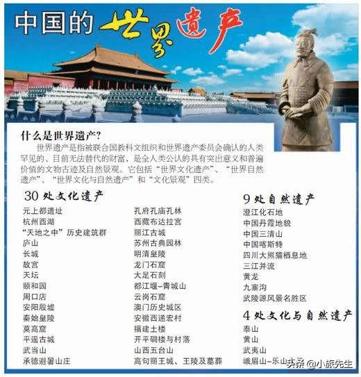 中国有哪些世界遗产?说不全,大概有五十多处吧。初略统计一下,笔者去过长城、北京故宫、天坛、颐和园、大运河、殷墟、杭州西湖、苏州园林、桂林、兵马俑、孔府(孔庙、孔林)、九寨沟、黄龙、黄山、庐山、泰山、武夷山、青城山、仙女山、金佛山、神农架、张家界、平遥古城、丽江古城、大足石刻、龙门石窟、云冈石窟、澳门等三十余处,每游一处,无不为中华文化之博大精深,为祖国江山之锦绣壮丽,而无比自豪。有生之年,争取游遍我国的世界遗产。因此,必须童心龟欲,蚁食猴行,锻炼身体,保卫自己!