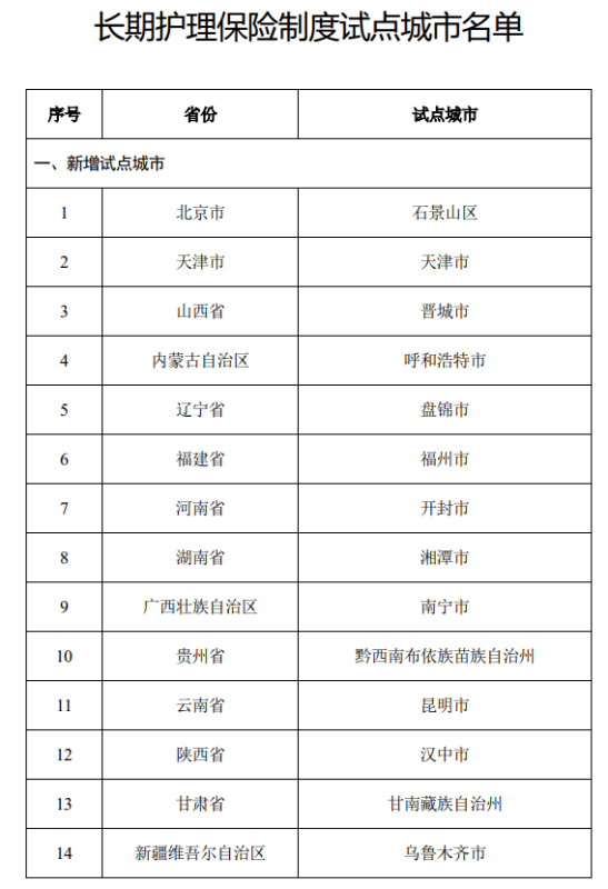 明确将北京市石景山区、天津市、山西晋城、呼和浩特、福州、辽宁盘锦等14个城市(区)纳入长期护理保险制度试点。加上原有的35个试点城市,包括河北省承德市、上海市、黑龙江省齐齐哈尔市、上海市、江苏省苏州市、南通市等,目前已有共计49个城市(区)被纳入长期护理保险制度试点当中,涉及全国28个省份