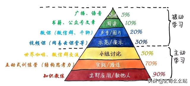 如果只是单纯地听别人讲,或者看书看演示,留存率最高只有30%,而讨论、实践和教授他人学习,知识留存率最高可达90%。