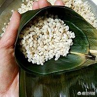 取两张泡好的粽叶,毛面相贴(用手能摸出来,一面光滑,一面微涩即为毛面),在叶尖三分之二的地方卷成60度左右的倒漏斗型,在卷好的漏斗内加三分之一的糯米,然后加肉。